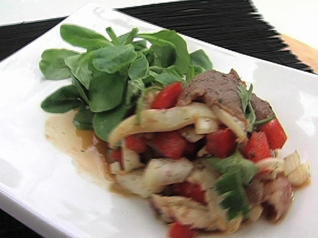 Севиче из морепродуктов.Состав:окунь — 20 гр;кальмар — 1 кусочек;тунец — 20 гр;помидоры — 1/2 штуки;лук — 1/2 штуки;сок двух лаймов;несколько листьев маш-салата;соевый соус, соль, хенкель — по вкусу.